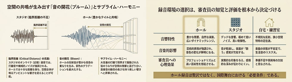 クラシックピアノ国際コンクールにおいて、ホール録音を選択することは現代の競争環境における「必要条件」です。ホールの音響が生み出す豊かな響きは、演奏者の技術を芸術へと昇華させ、審査員に対して強烈なインパクトを与えます。